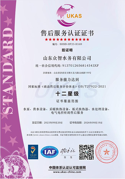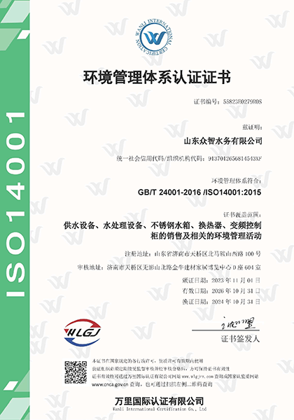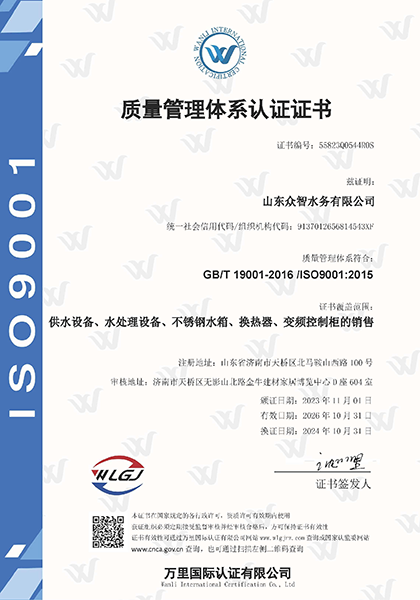 山東眾智水務有限公司成立于2011年,注冊于山東省濟南市。是一家集科研開發、設計、制造、銷售、安裝、調試服務為一體的綜合性企業,榮獲國家級高新技術企業、科技型中小企業、專精特新中小企業。多年來致力于給排水、暖通設備、水處理設備及行業物聯網的研發和生產。公司具有完善的設計、開發、檢測和產品制造能力,通過了三體系認證、CQC國家強制性產品認證、涉及飲用水衛生安全產品衛生許可批件、二次供水設備中國節能產品認證、二級機電安裝資質、AAA級資信等級認證、十二星售后服務認證等多項行業內認證證書。
